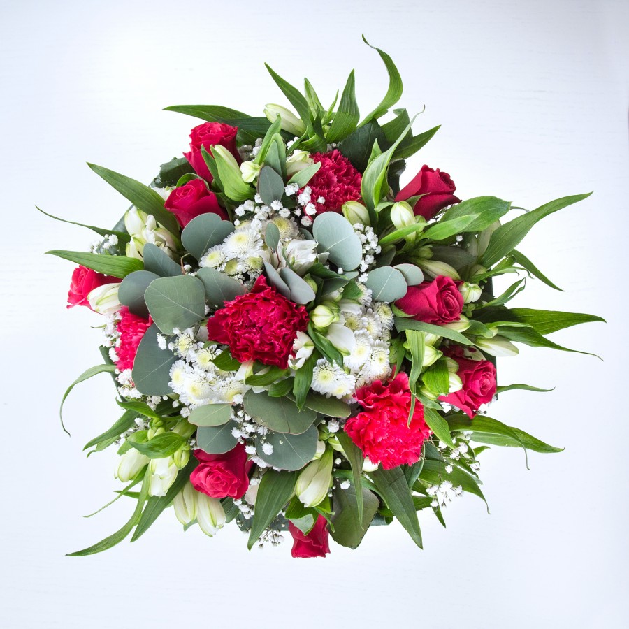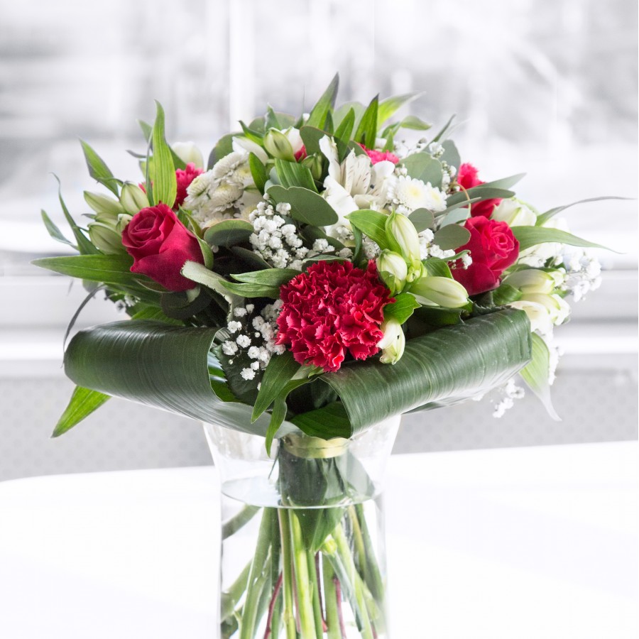 Rich red roses and soft white flowers created a perfect balance. Lovely bouquet.
